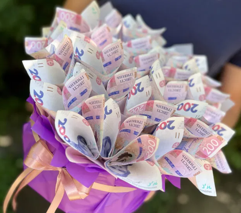 Щоб створити вражаючий сюрприз, знадобиться трохи креативу, стрічки, шпажки й, звісно, самі банкноти. Вибір купюр залежить не тільки від бюджету, а й від кольорової гами — 50 грн надають фіолетовості, 20 грн — зеленуватої ніжності. Букет з таких купюр буде виглядати яскраво, нестандартно та при цьому бюджетно.